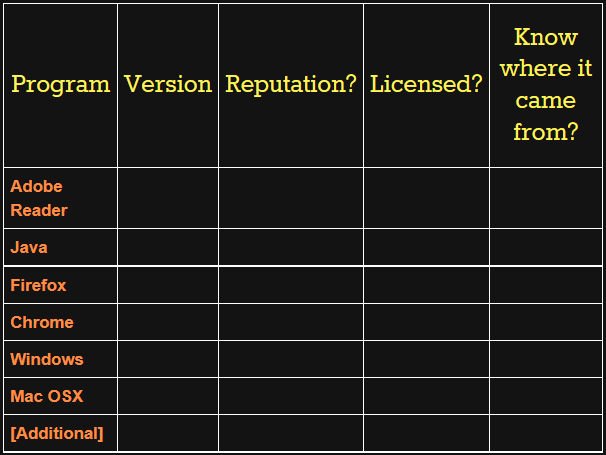 - Ask participants to examine it for software they don’t recognize or that have suspicious names (e.g. “SuperSpam-u-lator”).
