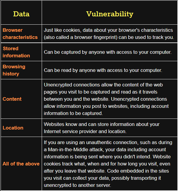 Refer back to your notes on the type of data created while browsing. Connect and explain these vulnerabilities - the table below outlines some of the vulnerabilities and how they connect back to certain types of data.