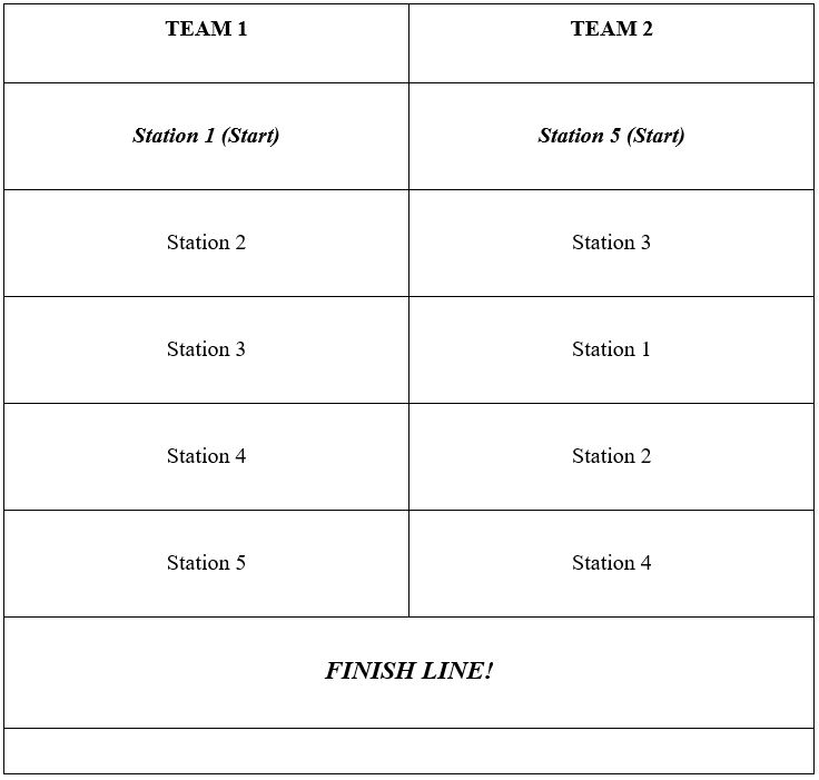 Step 2 | Distribute the five stations evenly throughout the space you have available, they can all be in the same room (or in different rooms if you have you have access) - this exercise works best if stations are in different spaces, as it makes the rally more dynamic and competitive. If possible, try to find location for the rally that is outside the training venue where you and the participants have been working – this will be provide a welcome change of scene.